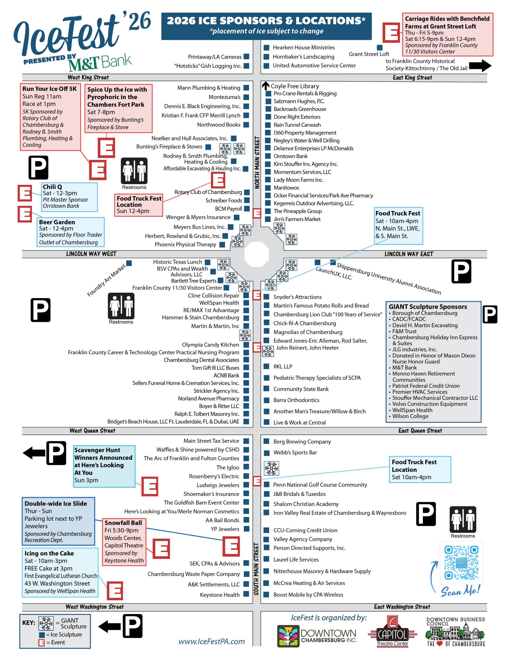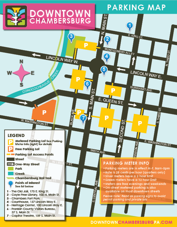 The above lots are owned by the Borough of Chambersburg and are available for public parking. 25 cents an hour. On-Street parking is on Main Street, Lincoln Way, Queen Street and 2nd Streets. Private lots may allow public parking and rules vary. Obey all parking signs on public and private parking.